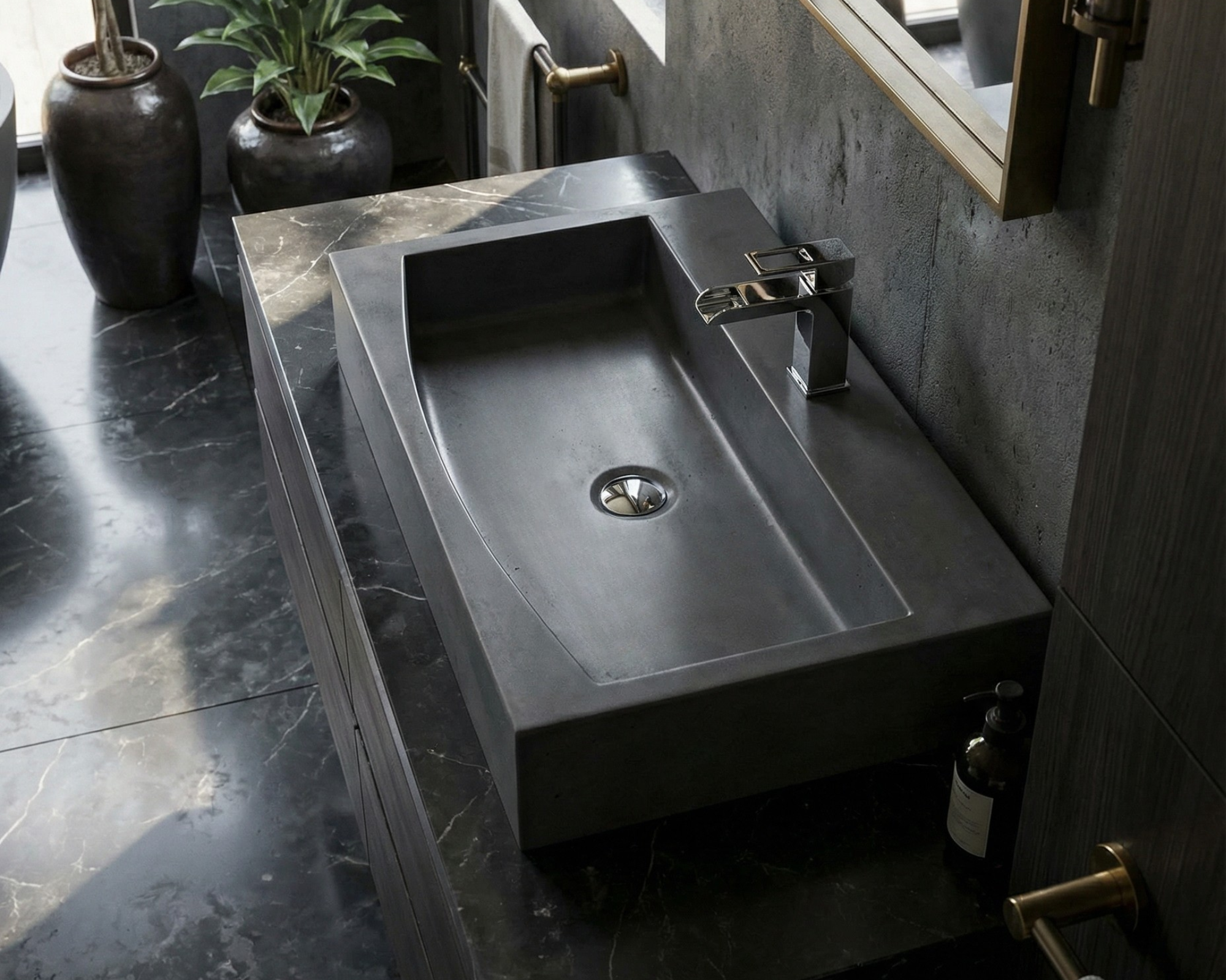 Ručně vyrobené designové umyvadlo z přírodního betonu určené pro montáž na desku nebo konzole s otvorem pro osazení baterie. Špičková povrchová úprava povrch ochrání před běžnými chemikáliemi používanými v domácnosti. Minimalistický tvar umyvadla zapadne do jakékoliv koupelny, nejvíce mu však sluší nevyzývavá jednoduchost. Exkluzivní materiál pak dostává prostor mluvit přímočaře a každé umytí rukou je bez přehánění něco speciálního.