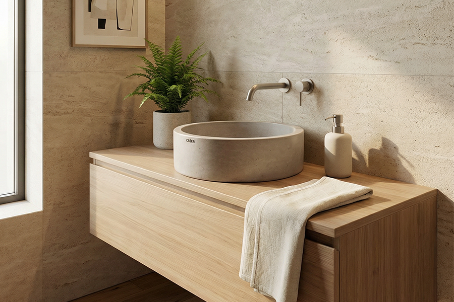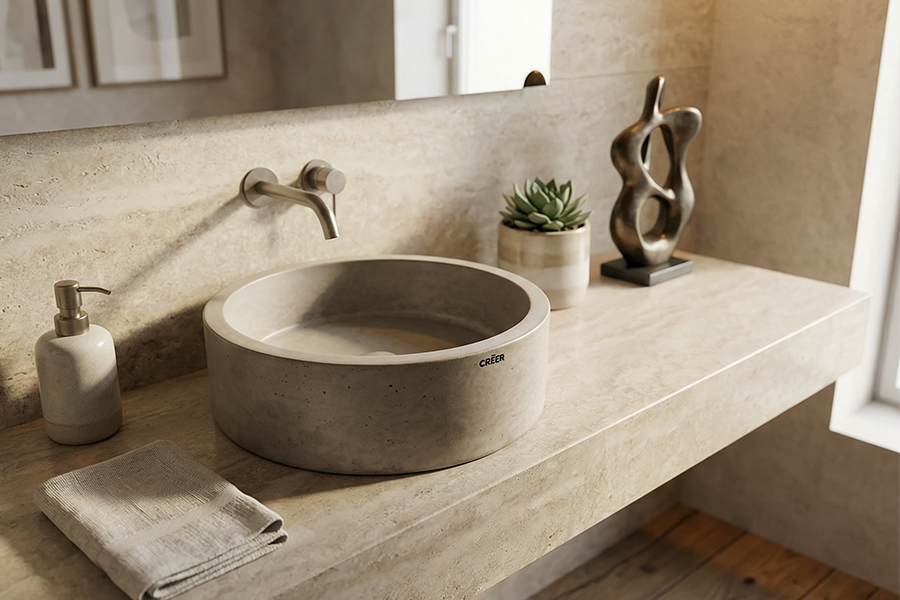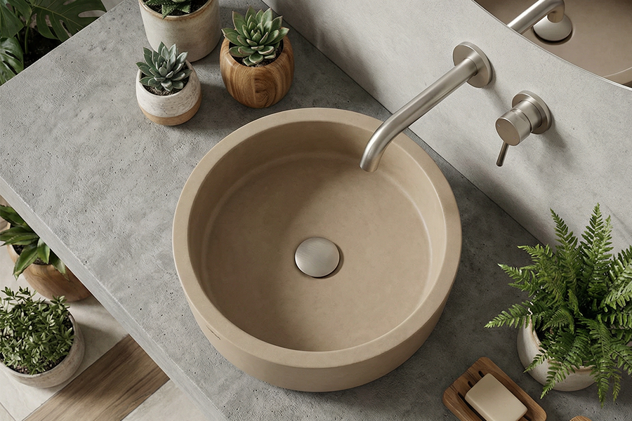 Ručně vyrobené designové umyvadlo z přírodního betonu je určené pro montáž na desku bez otvoru pro osazení baterie.